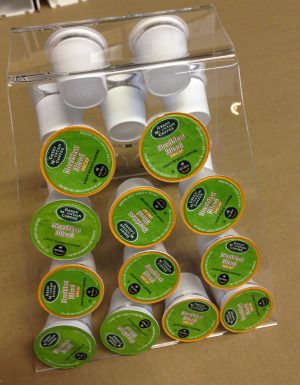 Keep your coffee pods organized and within reach. Made of clear sturdy plastic, this organizer holds 24 K-cups on your kitchen countertop or in your pantry.. Neatly displays a variety of k cups. Made in the USA.